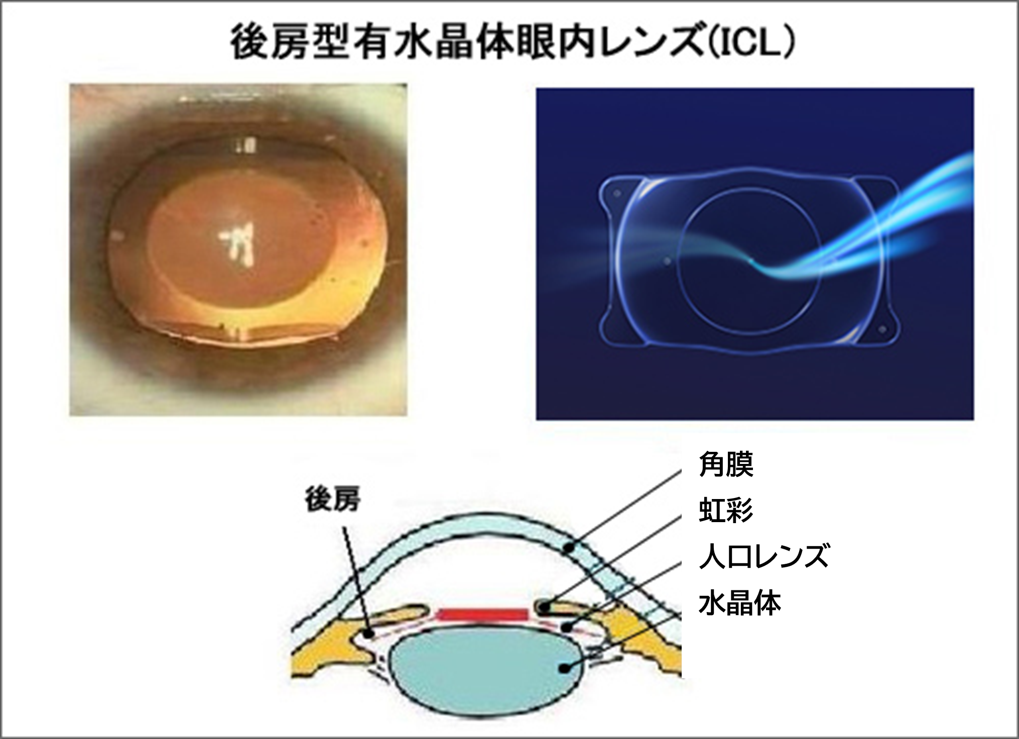 後房型有水晶体眼内レンズ(ICL)は、マイナス電荷を帯びているコラマーという素材からできており、タンパク質や細胞等の粒子を反発し寄せ付けないため、炎症が起こりにくく、長期間眼内にて安定します。また、ノングレア特性があり、手術後の眩しさが少ないレンズです。2010年現在、世界64カ国で承認されており、日本では2003年に臨床試験が開始され、2010年に承認されました。欧米ではレーシックと同じように普及している手術です。